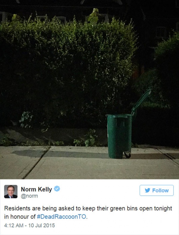 市議員更呼籲大家在今晚打開垃圾桶蓋,好讓其他的野生浣熊可以順利翻找食物,以此紀念這個為了食物跑到都市卻因此喪命的浣熊