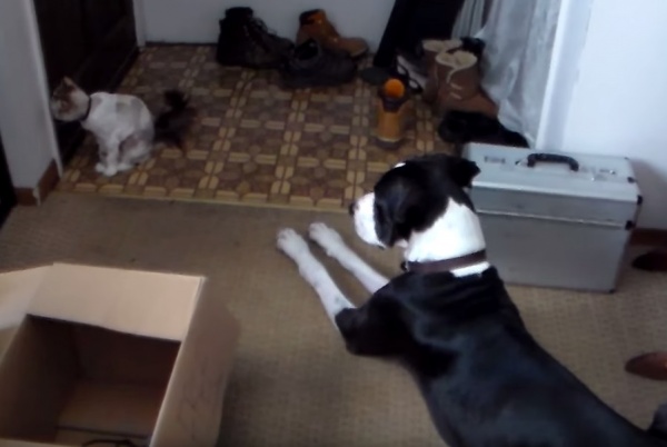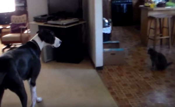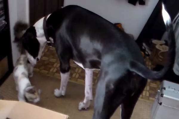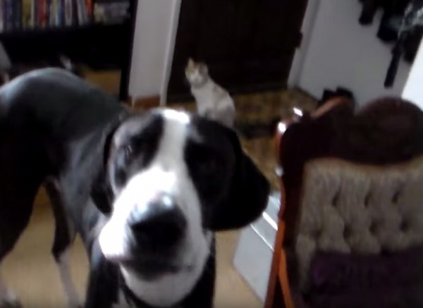天真善良的狗狗是富有同情心的,牠們對心愛的家人朋友都有天生的保護欲,可說是非常可靠的朋友!一名網友在YouTube上分享了家中貓咪與大丹狗的影片,當時貓咪hitomi似乎受傷了,所以帶著頭套,而大丹狗波特(Porter)則緊張地在旁守著牠。