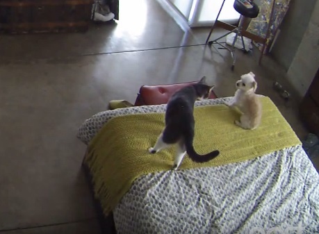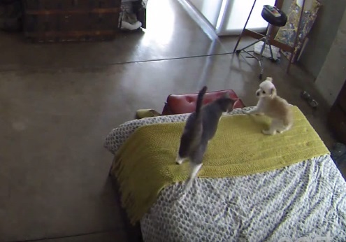 網友Devon Meadows家中養了一犬一貓,當他不在時,狗狗不停的吠叫,一直叫一直叫,叫到貓咪終於受不鳥啦~