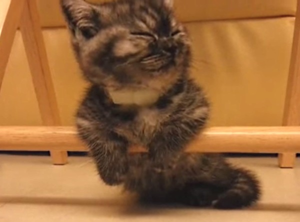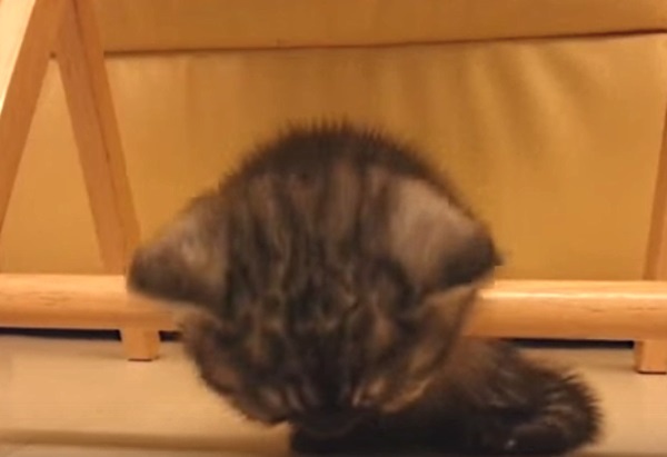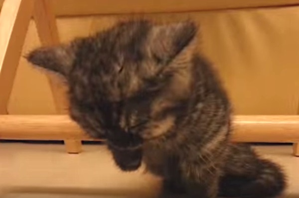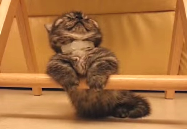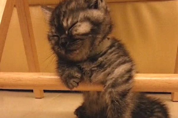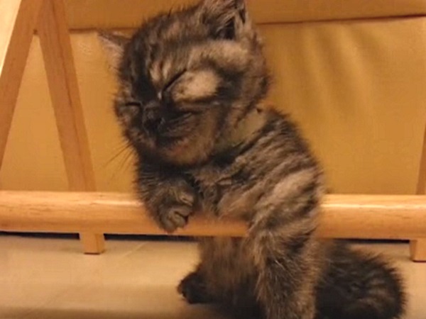 小喵星人因為神經還沒有發育完全,經常可以看到牠們表演一秒之內突然睡著的神技!再加上貓咪有種莫名的矜持,有時候想睡也不願意趴下來好好睡,於是就看到牠們在一些詭異的地方搖來晃去的打瞌睡!國外有隻二個月大的小小喵星人就是如此!某天牠竟然「掛」在椅腳的橫桿上打瞌睡,只見牠一會兒向後仰,一會兒又向前倒,簡直像是體操選手在練習單槓一樣,超級逗趣!