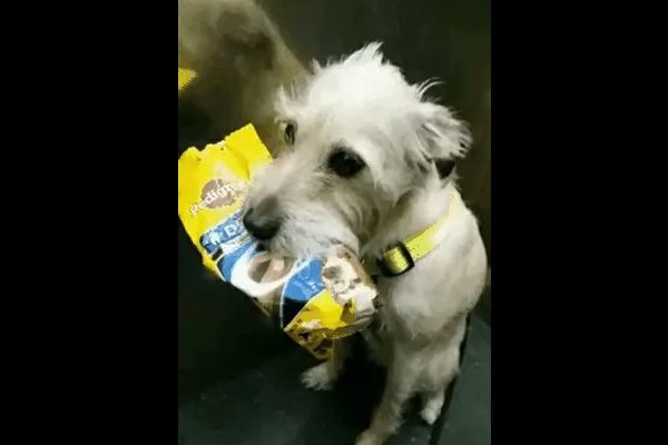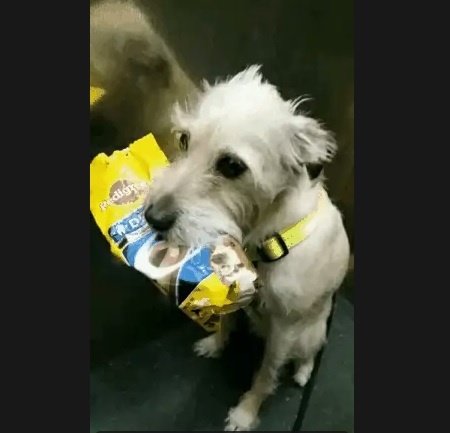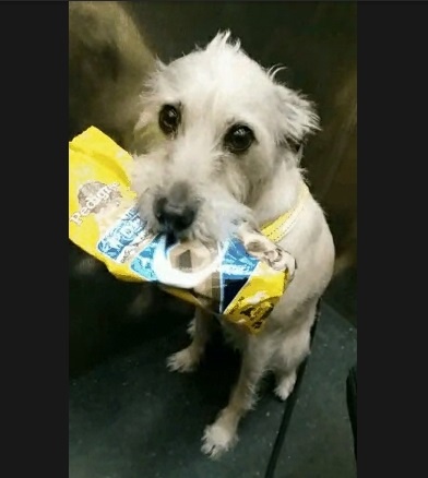 會帶著自己東西的狗狗真是太可愛了!相信牠一定很期待趕快打開來吃吧~