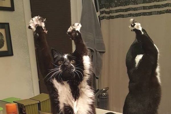 凱斯是隻黑白貓,牠的招牌動作就是像這樣高舉雙手在空中揮舞!