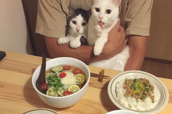每次只要餐桌上有香噴噴的食物出現時,毛小孩們就會忍不住也要過來參一卡!因此相信許多毛爸媽們都練就了一身即使被眼神鎖定攻擊也不為所動的功夫~日本也有二隻喵星人很愛在貓奴吃飯時來進行食物檢查,用牠們專注的眼神鎖定桌上的美食;而牠們的貓奴乾脆苦中作樂,把牠們盯著食物看的樣子拍下來,現在吃飯前一定要先來拍張照,已經變成他們家的一種習慣了呢!