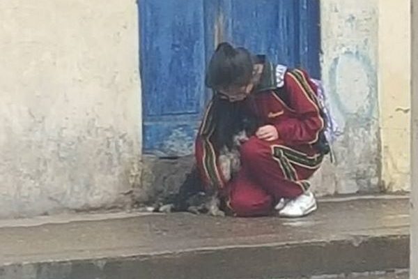 一位女大生看到路邊的流浪狗在雨中發抖,沒帶傘的她用自己的身體為狗狗擋雨