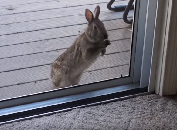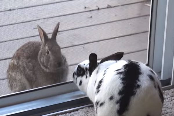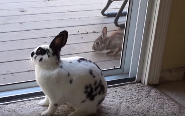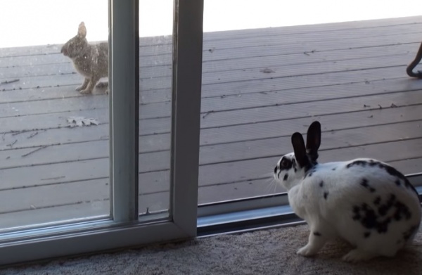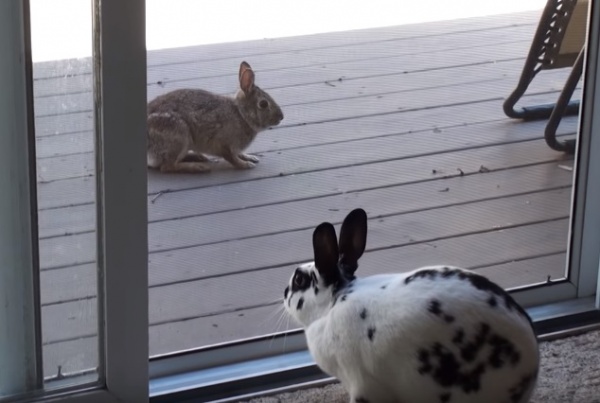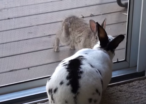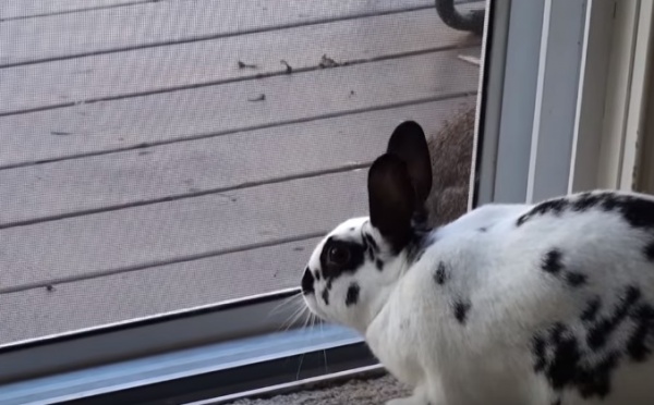 一個好天氣的下午,國外一位兔兔主人決定打開陽台的玻璃門,讓自家兔兔Pep坐在牠最喜歡的位子隔著紗門吹吹風、看風景;沒想到一隻意外的訪客突然出現,和Pep進行了一場另類的交流!