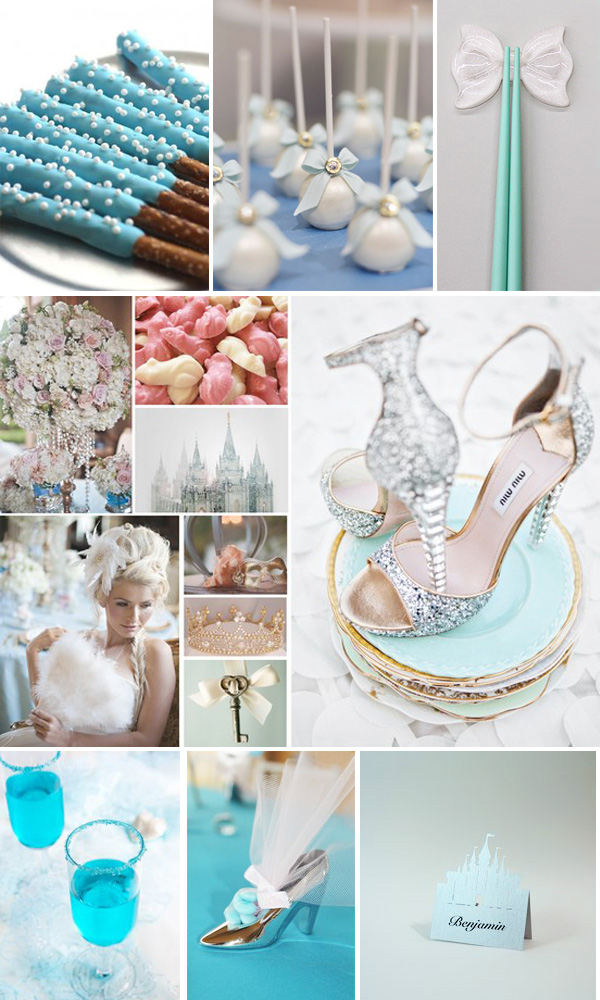 妳可用 Cinderella 與仙姑禮服的藍、Tiffany 綠、純潔的白、玻璃鞋上與禮服中帶點閃閃發光的銀、南瓜車與皇室的金,這幾種顏色來做婚禮小物選擇方向,並依照主題來設計婚禮上的裝飾物,利用城堡、玻璃鞋、老鼠造型巧克力來表達仙杜瑞拉開始的窮苦生活。