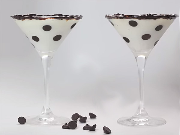 首先將杯緣塗抹上巧克力醬, 再將杯內放入巧克力豆裝飾成大麥町斑點