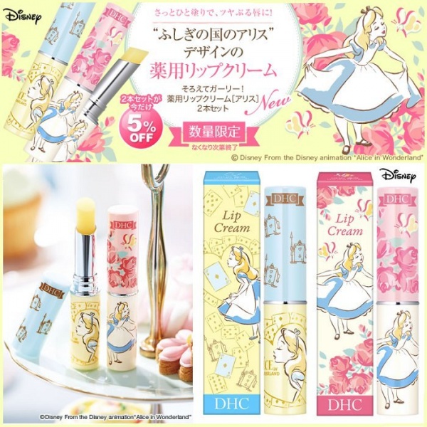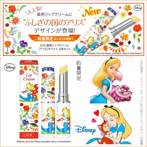 向來以素雅包裝的 DHC 也推出了愛麗絲夢幻繽紛包裝的護唇膏,目前只有在日本買得到,台灣則預計在10月推出美人魚、白雪公主、 長髮公主等限定版護唇膏。