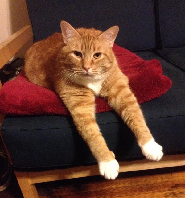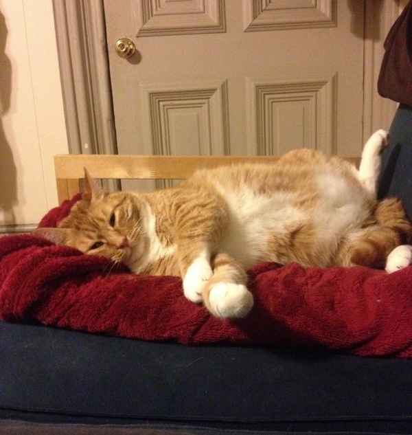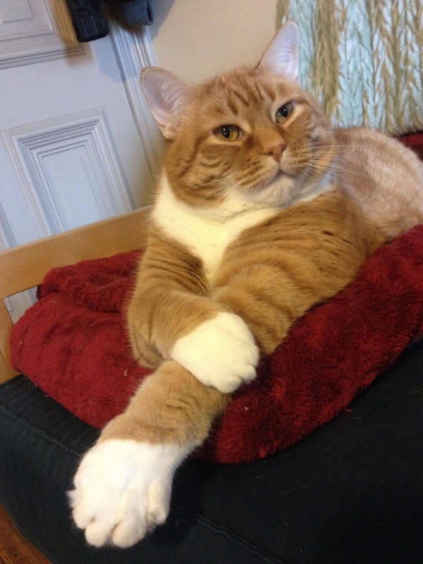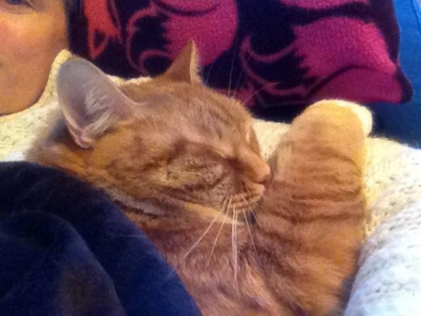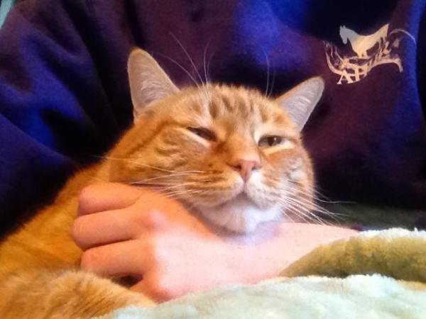 牠在收容所裡待了二個禮拜後,遇到了現在的貓奴Tegan。Tegan原本是和一群志工到收容所裡幫忙拍照送養,但那天她看到這隻橘貓一臉哀傷地縮在角落裡,便忍不住和工作人員提出要看看牠的要求