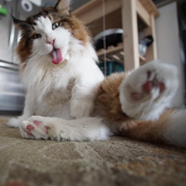 貓爸比說: Samson 是一隻甜蜜乖巧的好貓,但很堅強,生性活潑,不像一般貓咪孤傲。年僅 4 歲的 Samson,身長已達 4 尺長、體重已高達 28 磅(約 12.7 公斤)。獸醫表示:“緬因貓是貓中體型最大的品種,通常公貓體重可以達到 15 磅 (約 5.8 公斤) 到 25 磅 (約 11.3 公斤),所以說 Samson 並不胖也沒有過重的問題喔!
