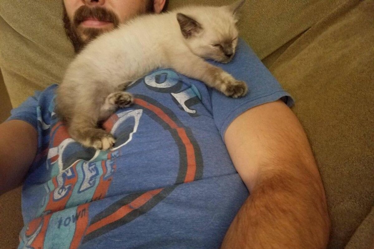 小貓 Priscilla 告訴這位男子牠現在已經是他生活中的責任義務囉! (人類! 我跟定你了!!)