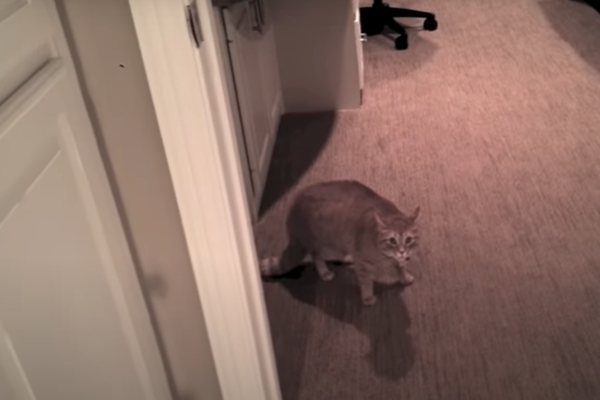 一位男子到朋友家做客,上完廁所要出去時發現朋友的貓土魯斯(Toulouse)在門口堵他!