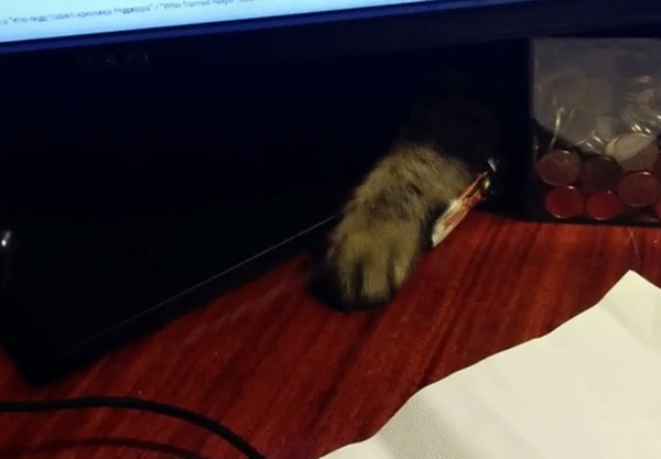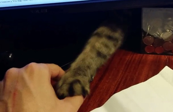 這隻喵星人埋伏於暗處,在貓奴想拿零食吃食,竟嚴厲出掌阻止,看樣子主子認為奴才該減肥了XD
