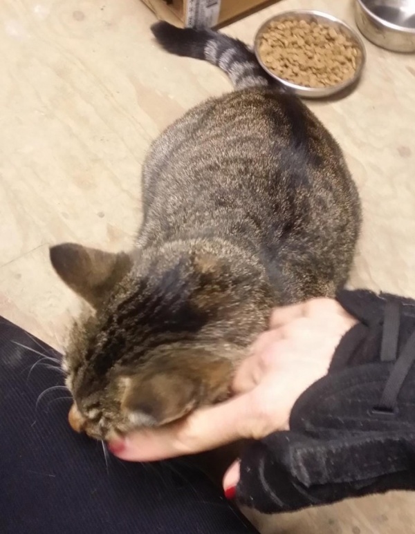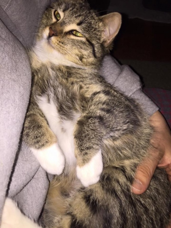 這隻虎斑貓叫做麗露,只要被人抱著就會開始大聲呼嚕嚕!