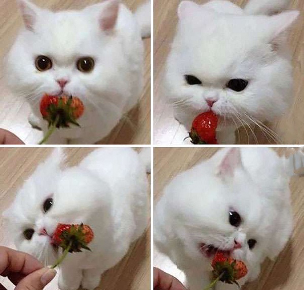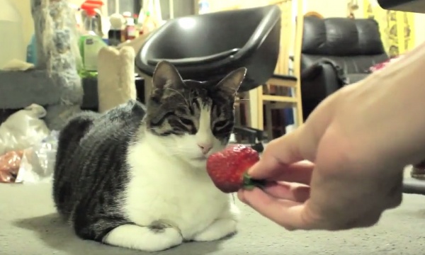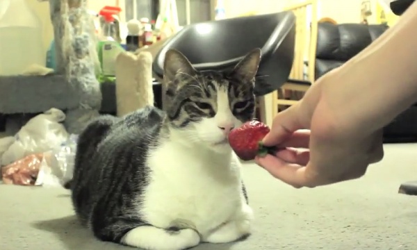 於是,這隻喵喵的飼主想要賞牠一顆肥美的紅草莓