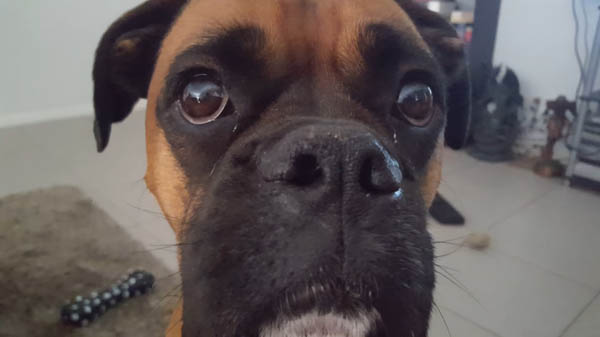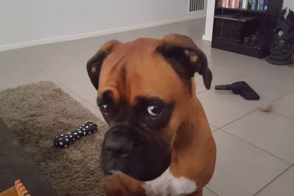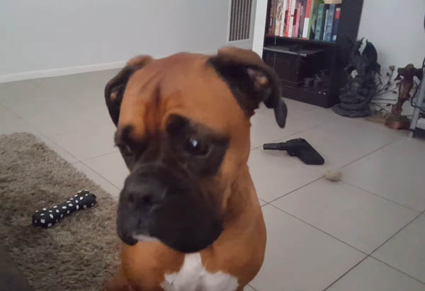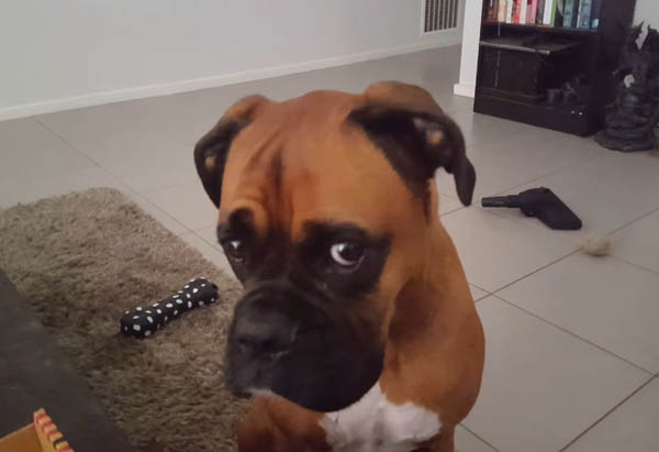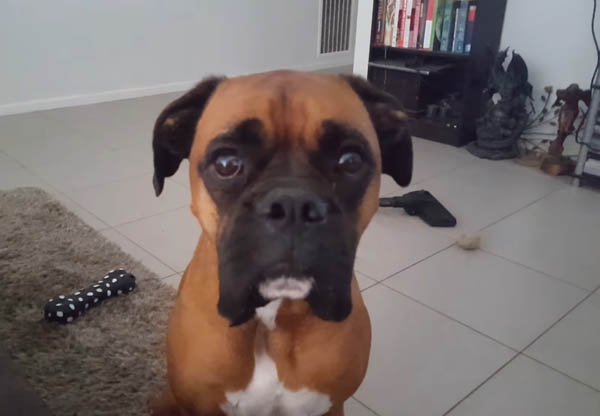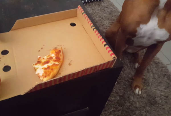 貪吃狗狗總會想盡辦法吃東西,這隻可愛的拳師犬Lily則是用眼神示意,要求馬麻給牠桌上的披薩吃,表情誇張的牠討吃過程超逗趣!
