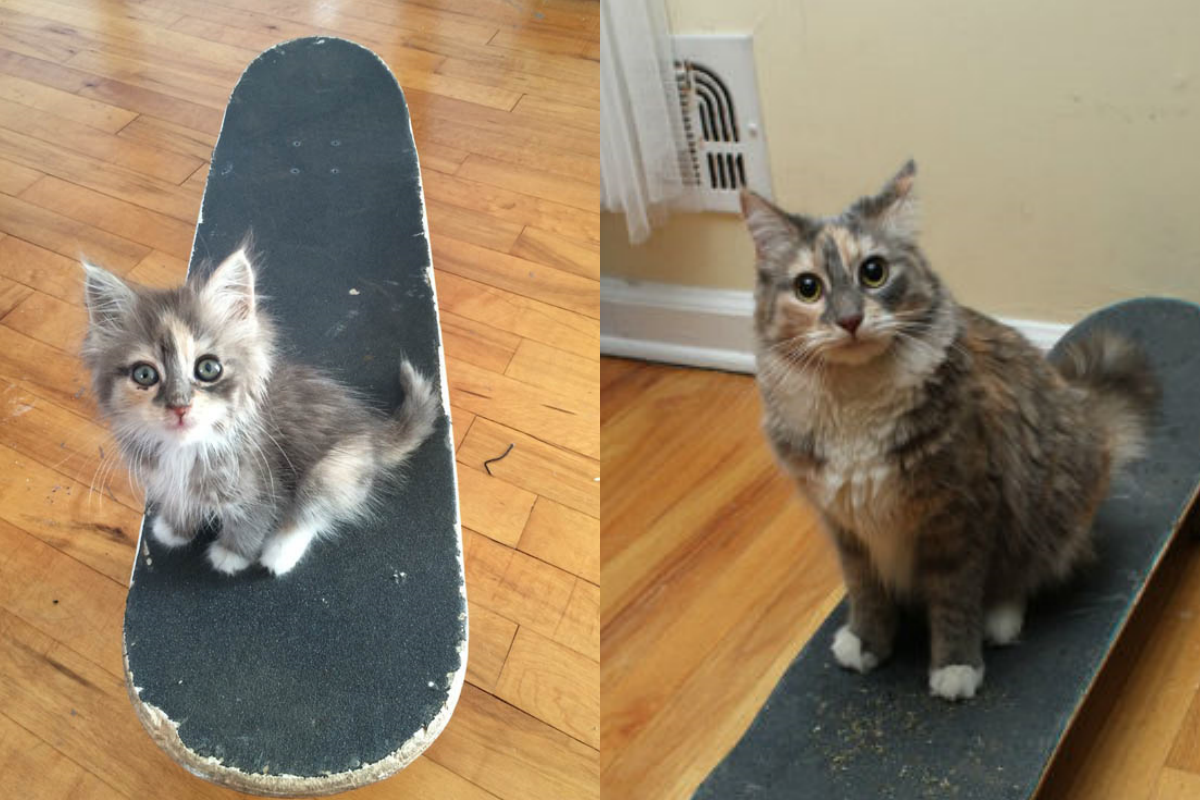 幾天後,小貓恢復元氣,Casey就給了牠一塊滑板,而牠就像天生好手一樣站了上去!