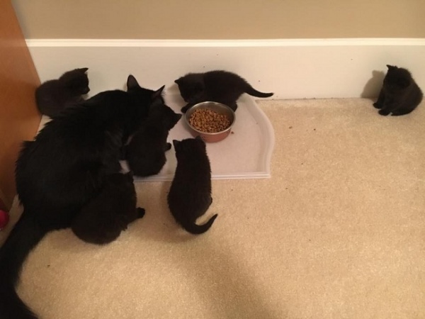 Belle媽咪正在教導牠的寶貝們如何從碗裡吃吃喝喝,牠正在為了孩子們的未來做準備喔!