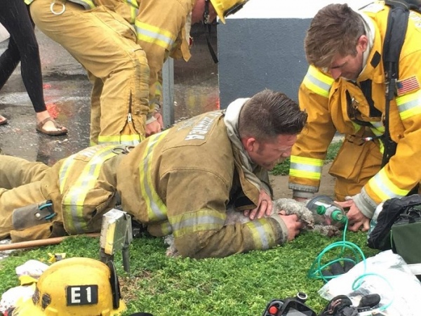 消防員Andrew Klein待在狗狗旁邊,然後開始展開急救措施。一開始大家先用氧氣罩試圖要讓狗狗恢復呼吸,但是發揮不了作用,於是急救員決定使用更激烈的方式。Billy說,一分鐘之後,消防員Andrew毫不猶豫地,開始對Marley進行CPR。這真的是一個很令人動容又敬畏的時刻。