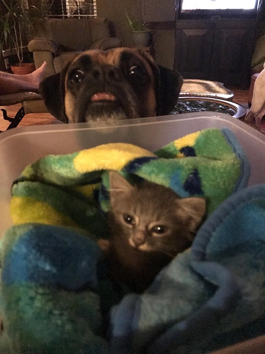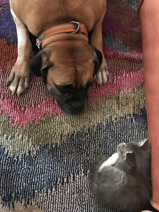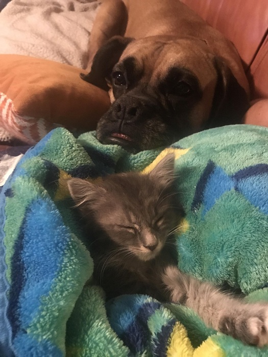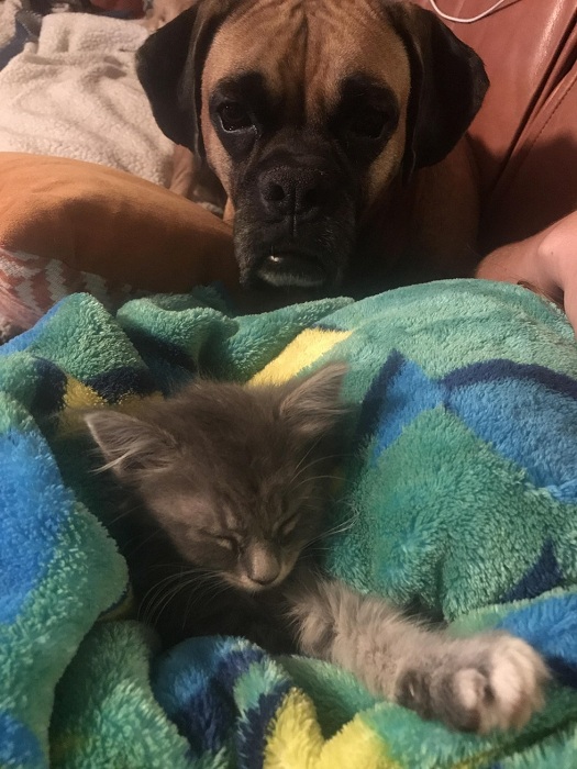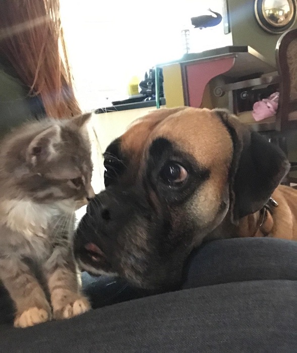 當小貓到達新家時,Will的狗狗拳師犬馬上過來迎接牠,希望能幫助喵喵。拳師犬的名字叫做Lennox,是從繁殖場救援出來的狗狗,聰明又乖巧。牠總是跟著喵喵到處去,如果喵跑到另一個房間,Lennox就會耐心地等待小貓自己回來。