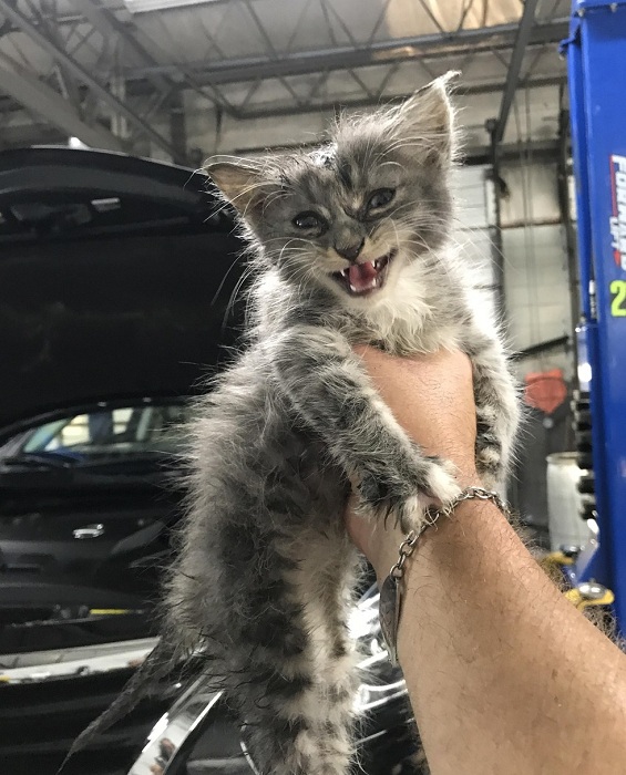 當Will在汽車經銷商的車輛上工作時,他聽到了小貓在引擎蓋裡的聲音,他打開了引擎蓋,看到這隻小貓在那探頭探腦的!他知道小貓需要立即性的幫助,馬上打了電話給在店內工作的機械師,請他回來幫忙一起救援喵喵,下班後經過了好幾個小時,大家費了千辛萬苦,終於把喵喵給救出來了!