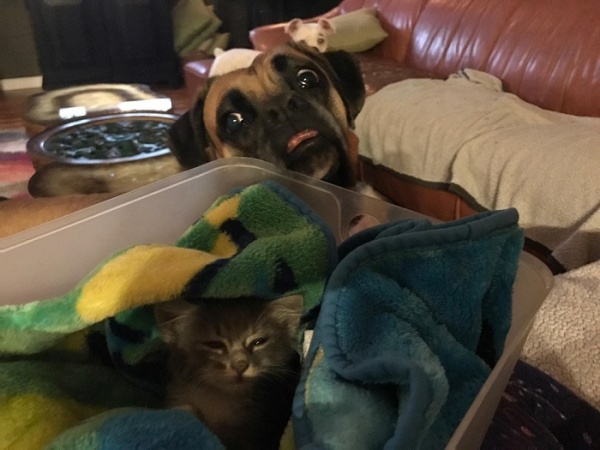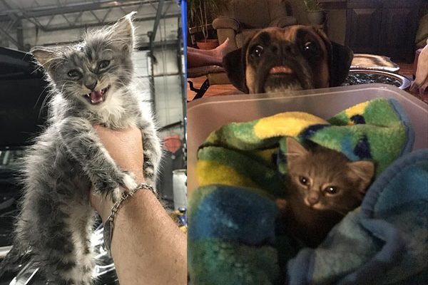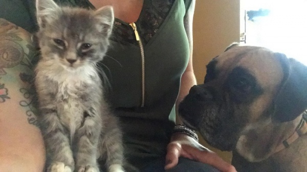 小貓躲在引擎蓋裡!一名男子把小貓給救了出來,還把牠帶回家照顧。家中的拳師犬決定要照顧這隻喵喵,要當24小時的貼身保鑣,不願離開喵喵的身邊!