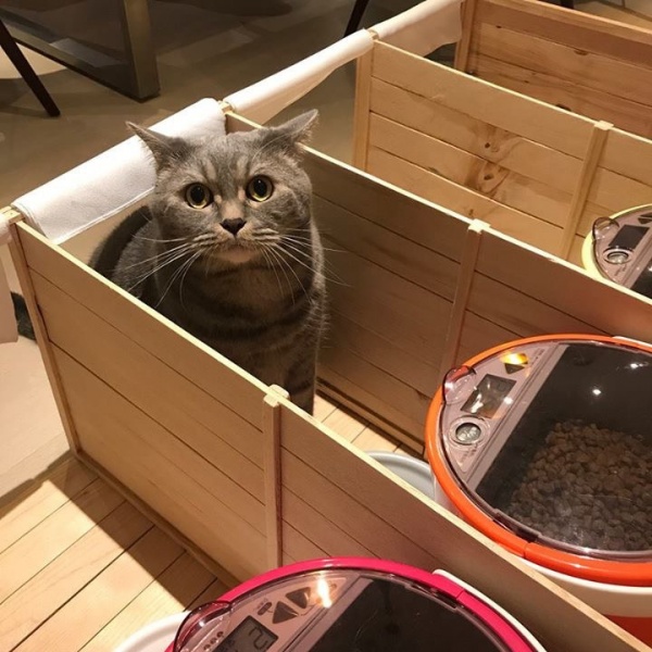 這四隻喵喵們都對新的用餐地點非常滿意,牠們可以在自己的小飯廳裡安心用餐呢!這種方法有助於在用餐時間分隔貓咪,也能比較妥善的控制食量。