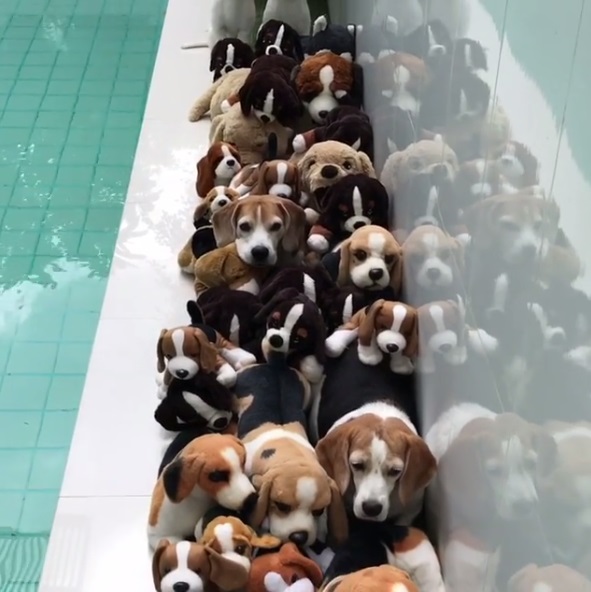 你可以從這一堆布偶裡找出真正的米格魯嗎?正想說,要辨別真假還不簡單,就是前排表現得戰戰兢兢的那個。可是好像在裡面又有一隻狗狗露出一派輕鬆的表情~嘴邊的肉都垂到兩邊去了,已經垂到旁邊的布偶上了啦!