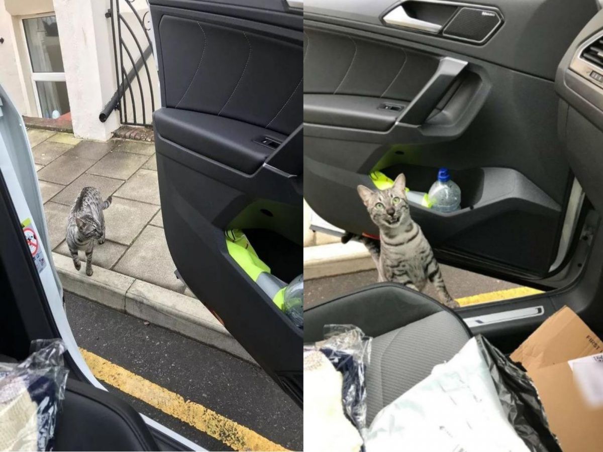 國外一隻叫做路易斯的貓咪有外出散步的習慣,某天牠悠哉地在家附近閒晃時,突然聽到一聲熟悉的叫喚,竟是牠的貓奴夏洛克!原來夏洛克開車出門,在離家400公尺的地方看到自家愛貓的身影,便停下來打開車門叫牠。路易斯在車門邊看到夏洛克,還張大嘴巴一臉驚訝的模樣,好像是在說:你怎麼也在這裡?!
