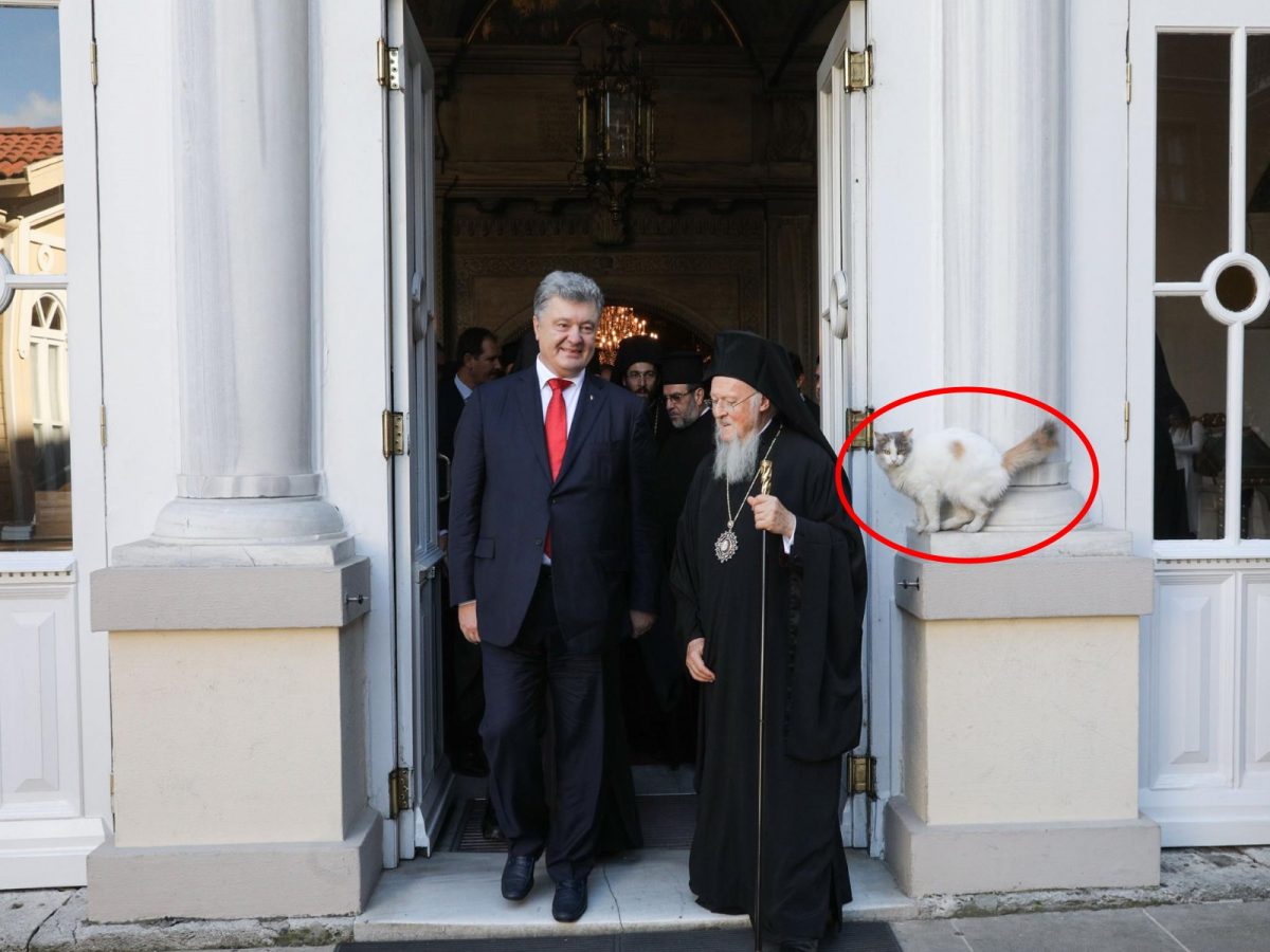 這其實是個嚴肅的場合。由於君士坦丁堡(今天的土耳其伊斯坦堡)普世牧首巴爾多祿茂一世同意烏克蘭正教會成為自主教會,不再受到俄羅斯東正教會的管轄,引發俄羅斯方面的不滿,東正教面臨了大分裂的危機。而其實烏克蘭總統波洛申科數個月前也為了此事拜會巴爾多祿茂一世,沒想到當時二人的世紀會面照,風采卻全被一隻喵星人搶走!