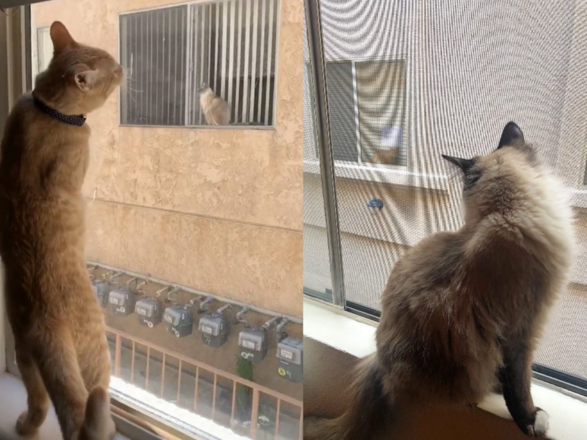 Coffman說:「當我一早醒來時,Simon在窗邊碎念,我抬起頭往窗外一看,發現對面鄰居窗邊竟然有一隻貓!我在這裡住兩年了,從沒見過他們的貓。」(圖/twitter@kenziecoffman) 不過一開始對面的Theo完全沒有注意到牠,所以Simon不停在窗台上跳來跳去,試圖引起牠的注意。 想到歌手Taylor Swift的You Belong With Me這首歌, Coffman決定來開點小玩笑。