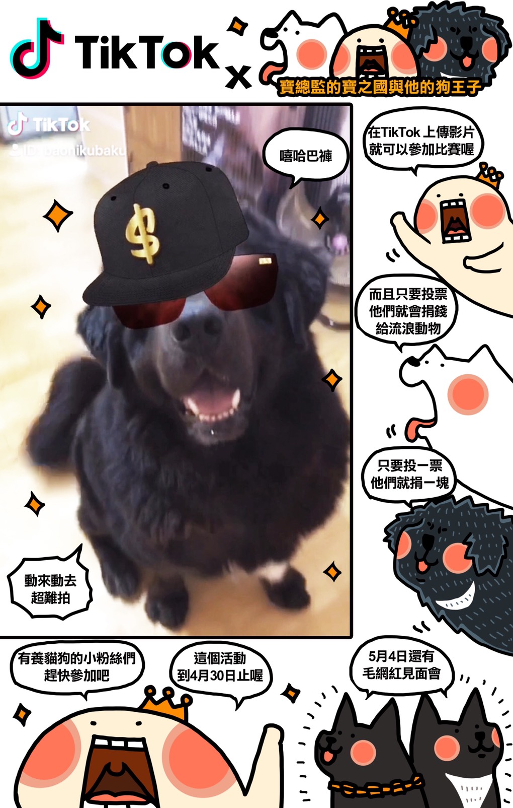 寶總監經常在自己的粉絲頁「寶總監的寶之國與他的狗王子 empire of director bao & niku & baku」分享泥褲與巴褲的生活點滴,可愛的圖文再加上寶總監獨特的霸氣口吻,擄獲不少粉絲的心。而這次寶總監特別拍下巴褲 的影片上傳到TikTok舉辦的公益活動「#家有毛網紅」 ,利用可愛特效展現出巴褲少見的另一面,相信又要讓小粉絲們為之瘋狂啦!