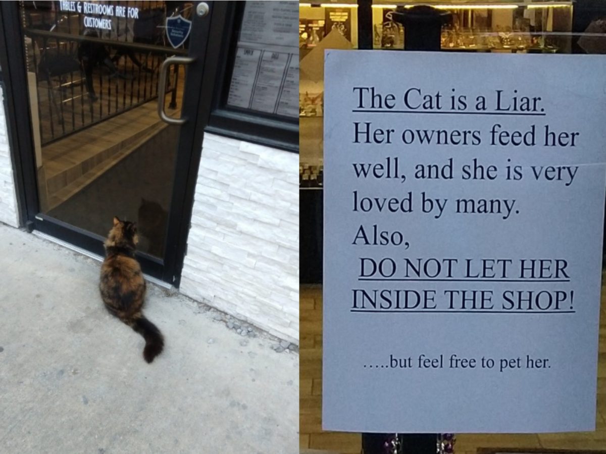 We’re in New Orleans and were walking down a street when we saw this cat outside a closed coffee shop. A woman was working inside so we knocked and pointed to the cat, asking if she belonged inside there. The woman pointed to a sign which was to the left of the door. pic.twitter.com/9KKEwrPut0