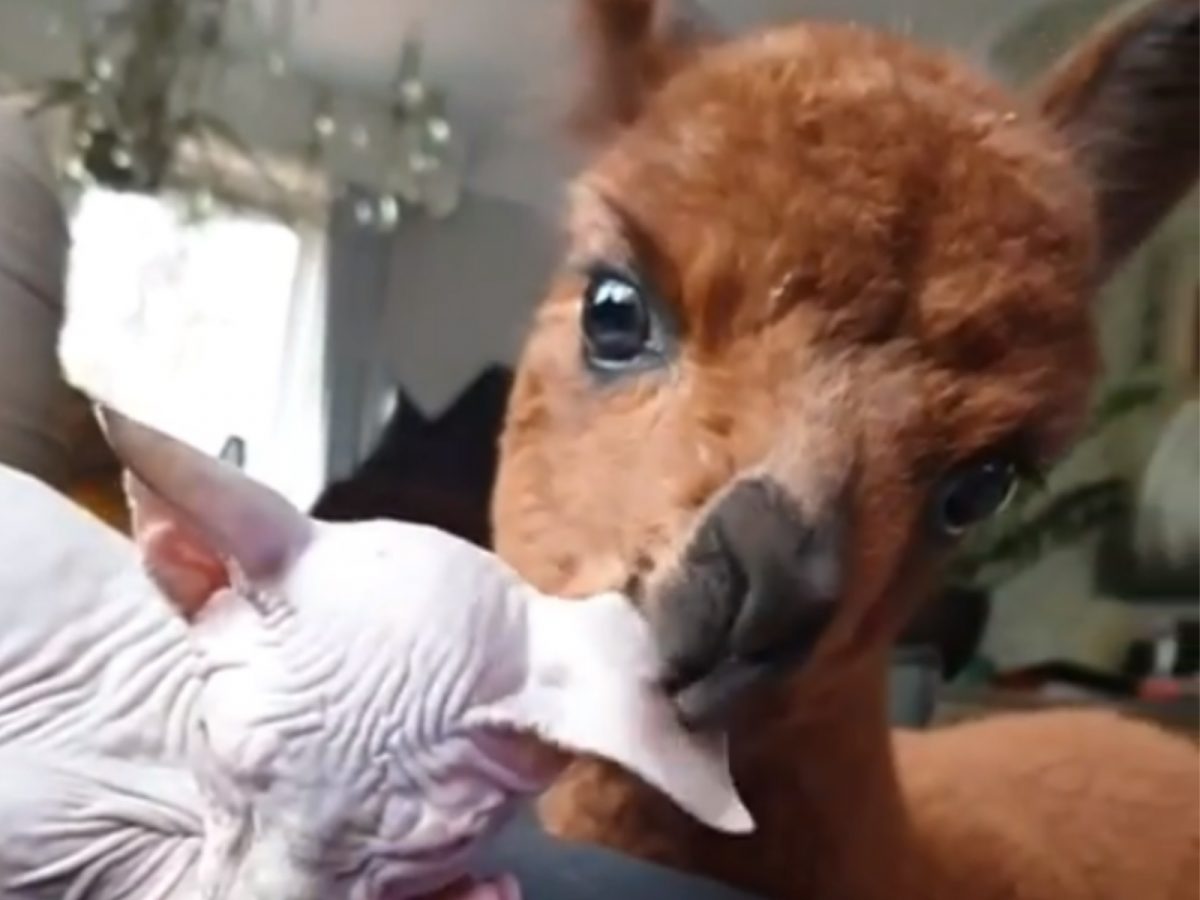 羊駝Moushi和無毛貓Spynxy是超級好朋友,兩個在一起的時候,總是被主人拍下幫對方舔舔咬咬,清理身體的畫面,感情真的超級好的啦!
