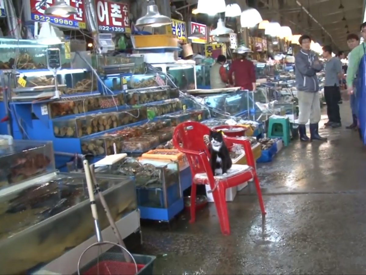 韓國某魚市場裡有個有趣的景象,貓店長Suhyup坐在魚攤前的紅椅子上,不時左右張望,確認魚攤周邊一切安全。不只不會偷吃魚,上班時也會一直坐在椅子上不亂跑,還會幫忙抓老鼠,真的是超級敬業!