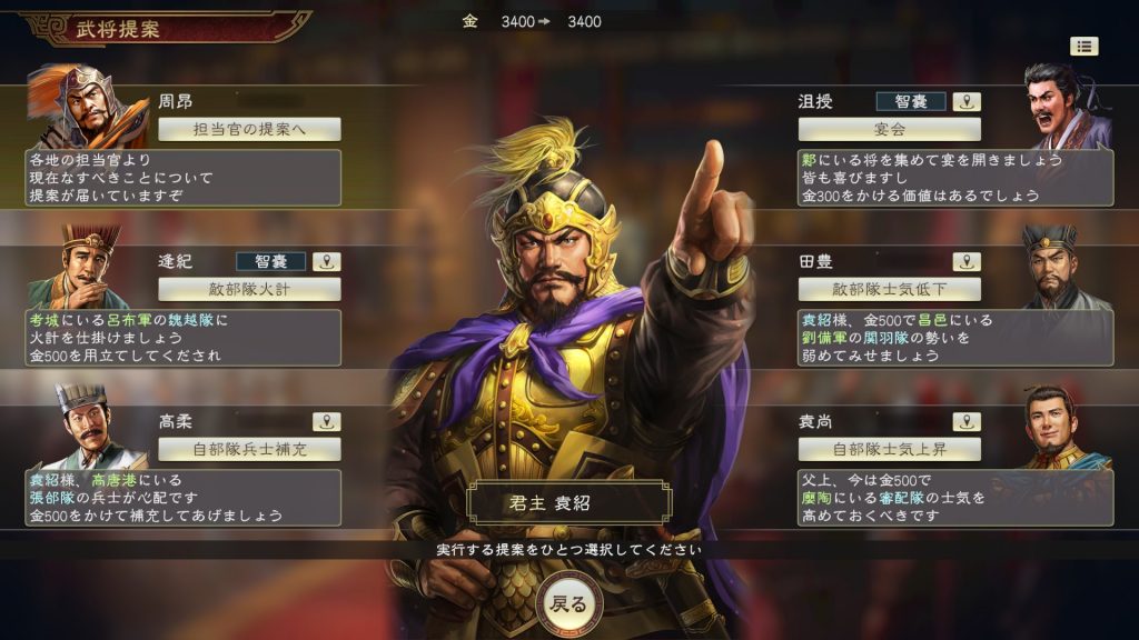 武將們的「提案」──在各種局勢中提出自己的意見武將除了接受君主的命令執行各種指令外,也會自行思考評估局勢,將對勢力必要的事情「提案」給玩家。「提案」內容五花八門,像是對敵方部隊設下策略、舉辦宴會等。武將提出的意見也與其個性相符。特別像是擁有個性「智囊」的武將,在提案中登場的次數也較多,對勢力而言是相當重要的人才。