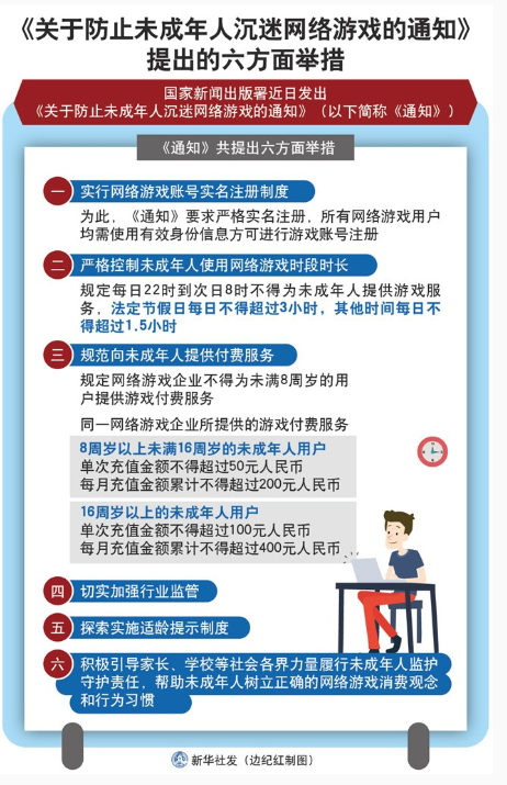 「關於防止未成年人沉迷網絡遊戲的通知」指出,網路遊戲廠商不得向未滿 8 歲的用戶提供付費服務。若是 8 ~ 16 歲的用戶,單次儲值金額不得超過 50 元人民幣,每月儲值金額不可超過 200 元人民幣。16 歲以上的用戶單次儲值金額不可超過 100 元人民幣,每月儲值金額不得超過 400 元人民幣。