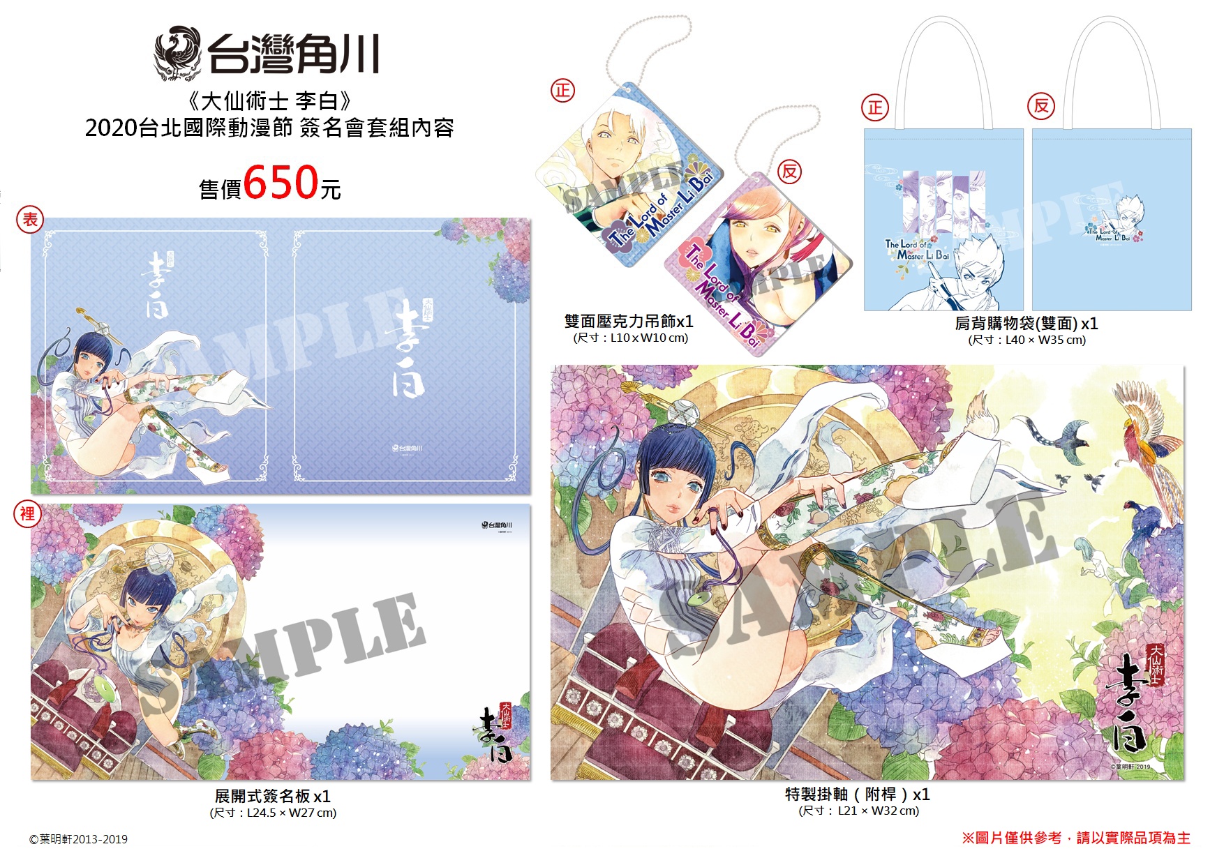 李白04書衣書腰含特色 為回饋廣大的忠實李白粉絲,台灣角川特別請葉明軒老師精心繪製絕美特繪圖,規劃以「美人」為主題的2020台北國際動漫節 簽名會限量套組,內含「展開式簽名板」、「肩背購物袋」、「雙面壓克力吊飾」及「特製掛軸(附桿)」。簽名會限量套組將於12/26(四)起在台灣角川官網開賣。