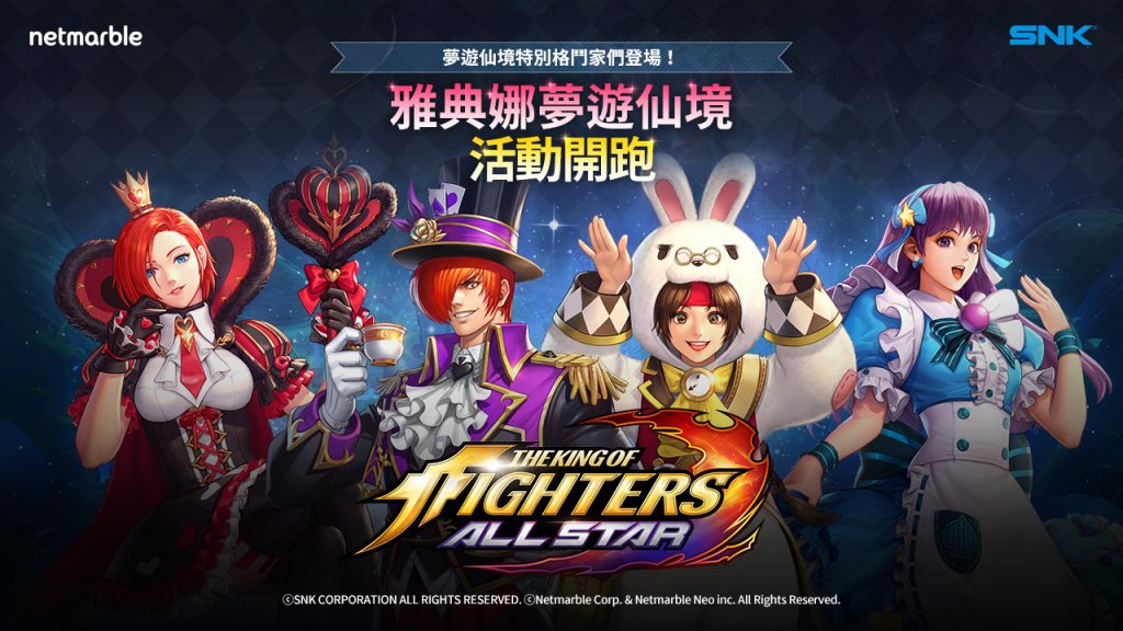 網石公司今(21)日宣布,動作RPG手遊《THE KING OF FIGHTERS ALLSTAR》即將推出最新主題「雅典娜夢遊仙境」!從現在起,玩家可透過完成特殊活動關卡,獲取夢遊仙境裝扮的「八神庵」;或使用紅寶石和代幣召喚,獲得夢遊仙境特殊造型的限定角色-「雅典娜」、「坂崎百合」和「凡妮莎」。