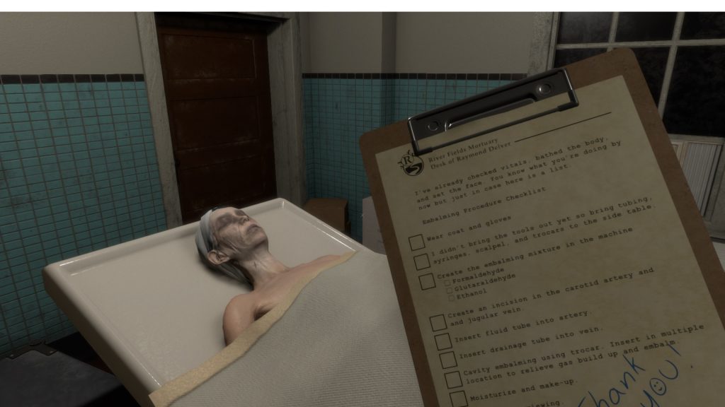 遊戲中採取第一人稱視角。玩家的任務很簡單,只要照著清單上的步驟,就可以一步一步地完成防腐的工作。但過程中將會出現許多超自然現象,因此建議膽小者可以看看網路上的遊玩影片過過癮就可以。整個遊戲流程大約10分鐘就可以完成。