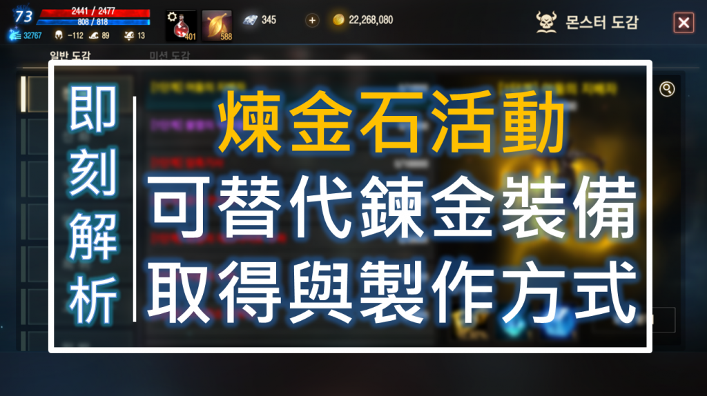 韓版最新的煉金石活動可以替代鍊金的藍、紅裝備,在世界王裡面有機會掉落,機率比藍裝掉落高,當然也可以透過製作取得,先了解起來吧!