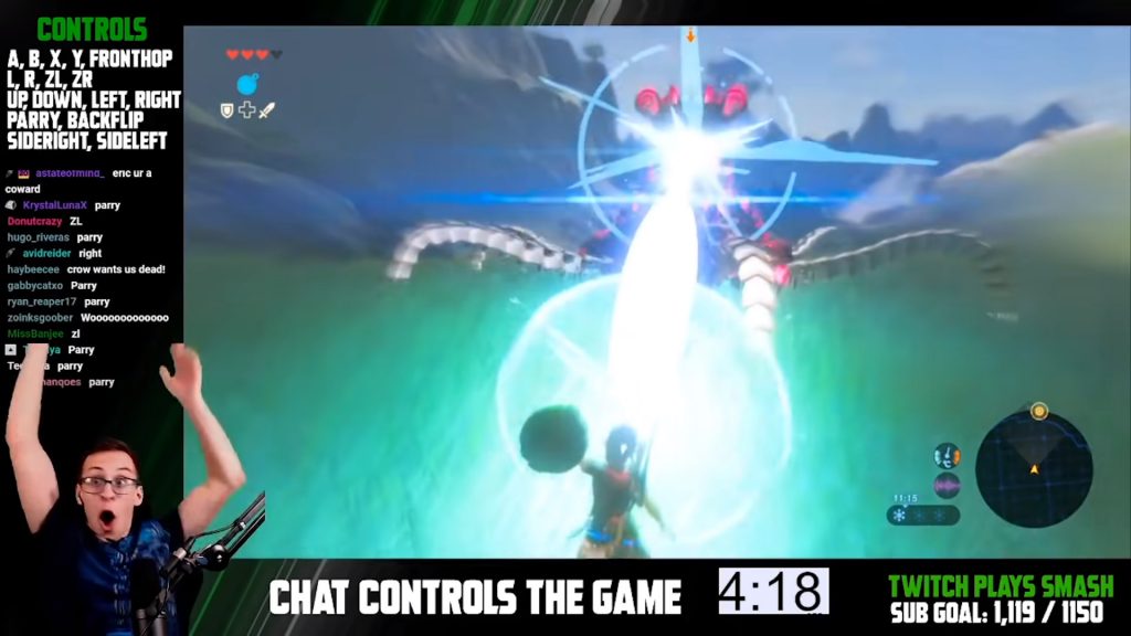 最初即便設立了加速用的投票機制,仍然耗時了16天才全通遊戲 而本次用《薩爾達傳說:曠野之息》挑戰這種玩法的,則是知名的實況主Pointcrow(就是那個挑戰不走半步路通關的男人),他效法了「Twitch PlaysPokémon」的精神,在他的頻道進行了進行的聊天室挑戰,但為了避免太過漫長的過程,他也進行了某些限制。像是設定了簡化操作,讓使用者能夠直接透過聊天室使出「後空翻」、「招架」等動作,同時也將每次挑戰的時間限制為只有五分鐘,他本人也會經常性的接管操作。