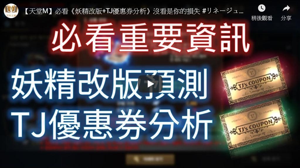 妖精改版即將到來,究竟何時會改?下 2 張 TJ 優惠券(GAMA COUPON)又會是什麼樣子?跟合成保底系統關係可大了!趕快點進影片看看吧! 我是廣告 請繼續往下閱讀 相關新聞 《任天堂明星大亂鬥特別版》最終鬥士出爐!《王國之心》索拉參戰Snake欣賞薩姆斯屁屁!法國任天堂推特圖片遭控性騷擾急刪文Xbox總裁:主機供貨不足的問題今年恐怕無法解決 TJ COUPON天堂M高階妖精