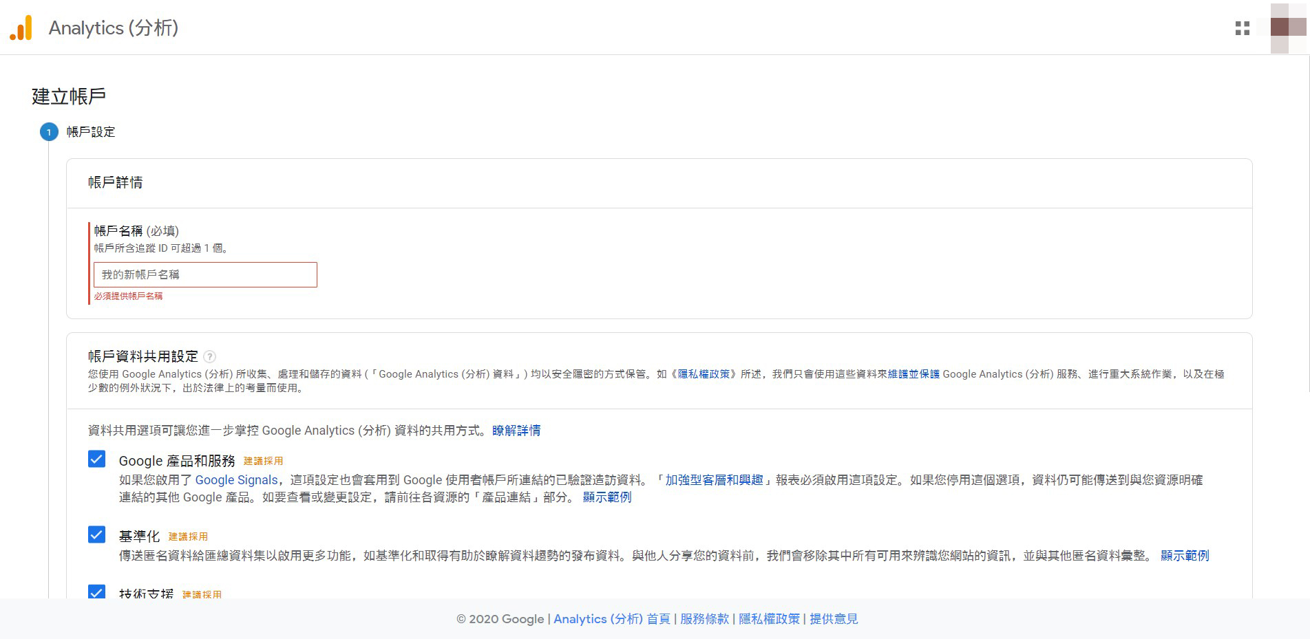 4.建立帳戶>填寫【帳戶名稱】(一個帳號可以管理多個網站,建議填寫網站名 稱)填寫完畢之後就按下一步