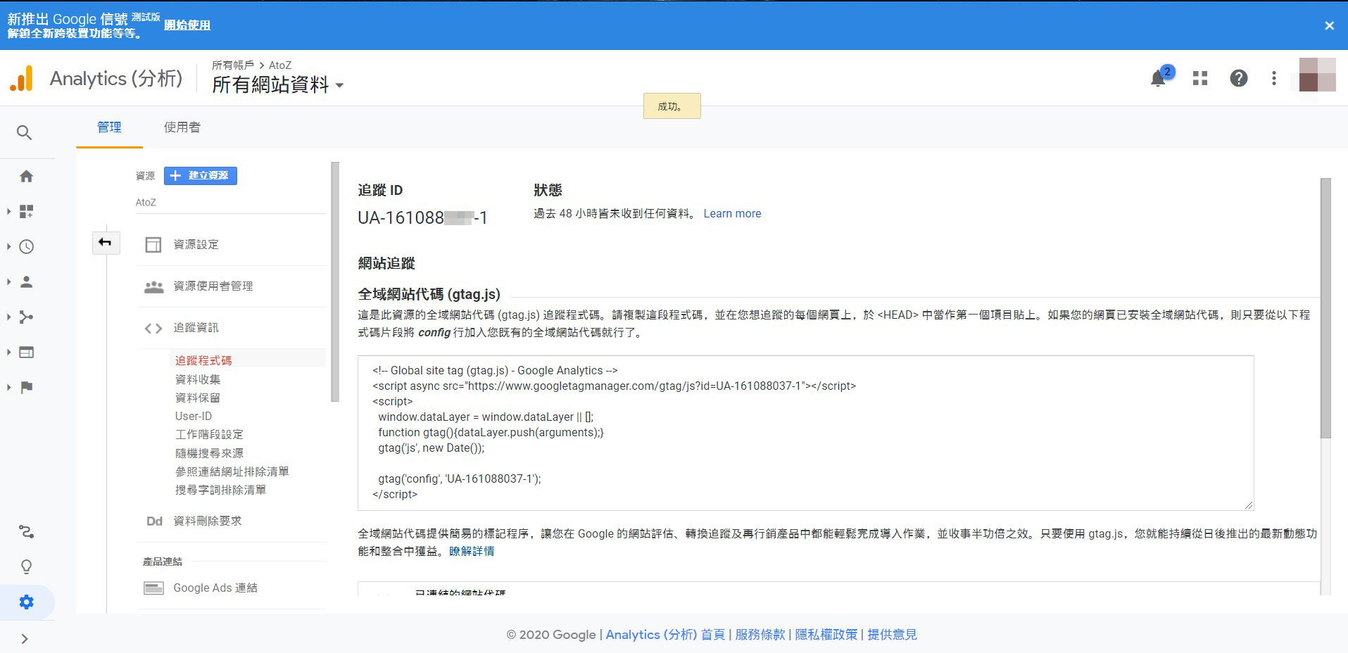 站後台GoogleAnalytics才能開始收到網站回傳的資訊。