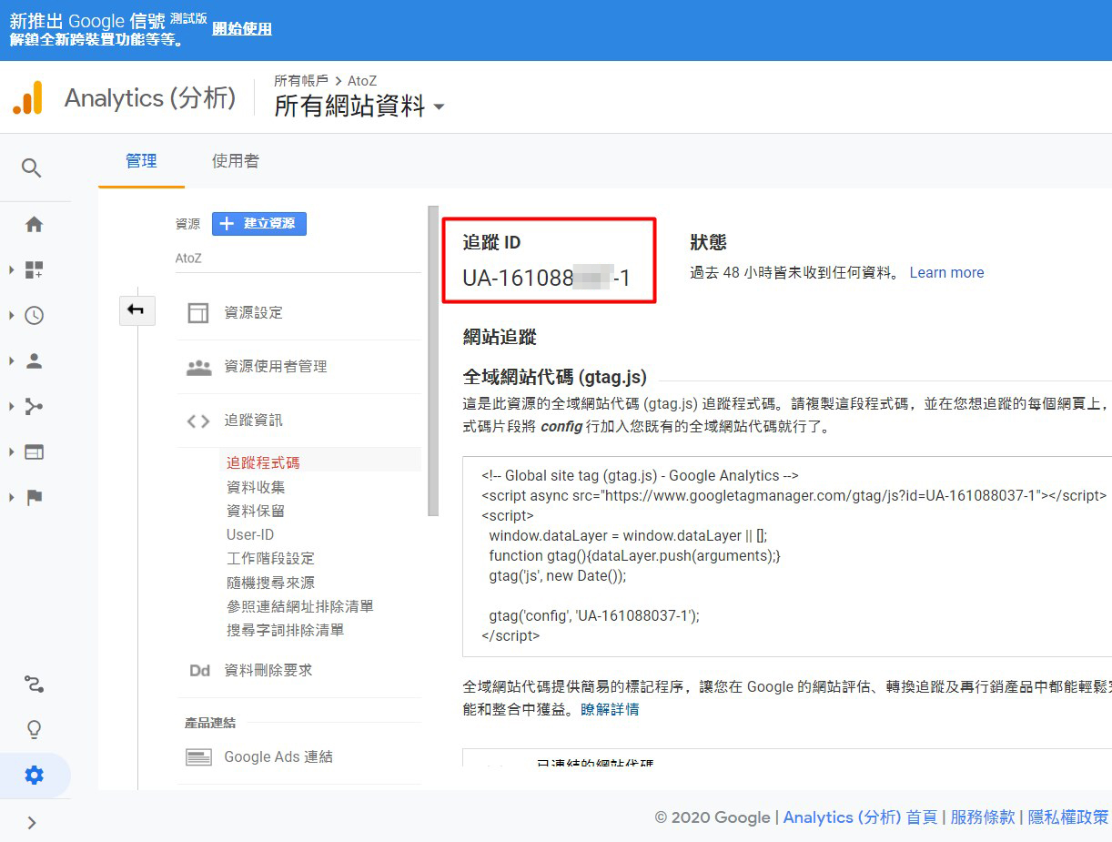 9.接著系統會直接跳到管理的頁面,中間上方有一串追蹤ID這組就是你專屬的網站追蹤編號,到這一步還不代表完成埋入網站,需要將這串id貼到你的網站後台GoogleAnalytics才能開始收到網站回傳的資訊。