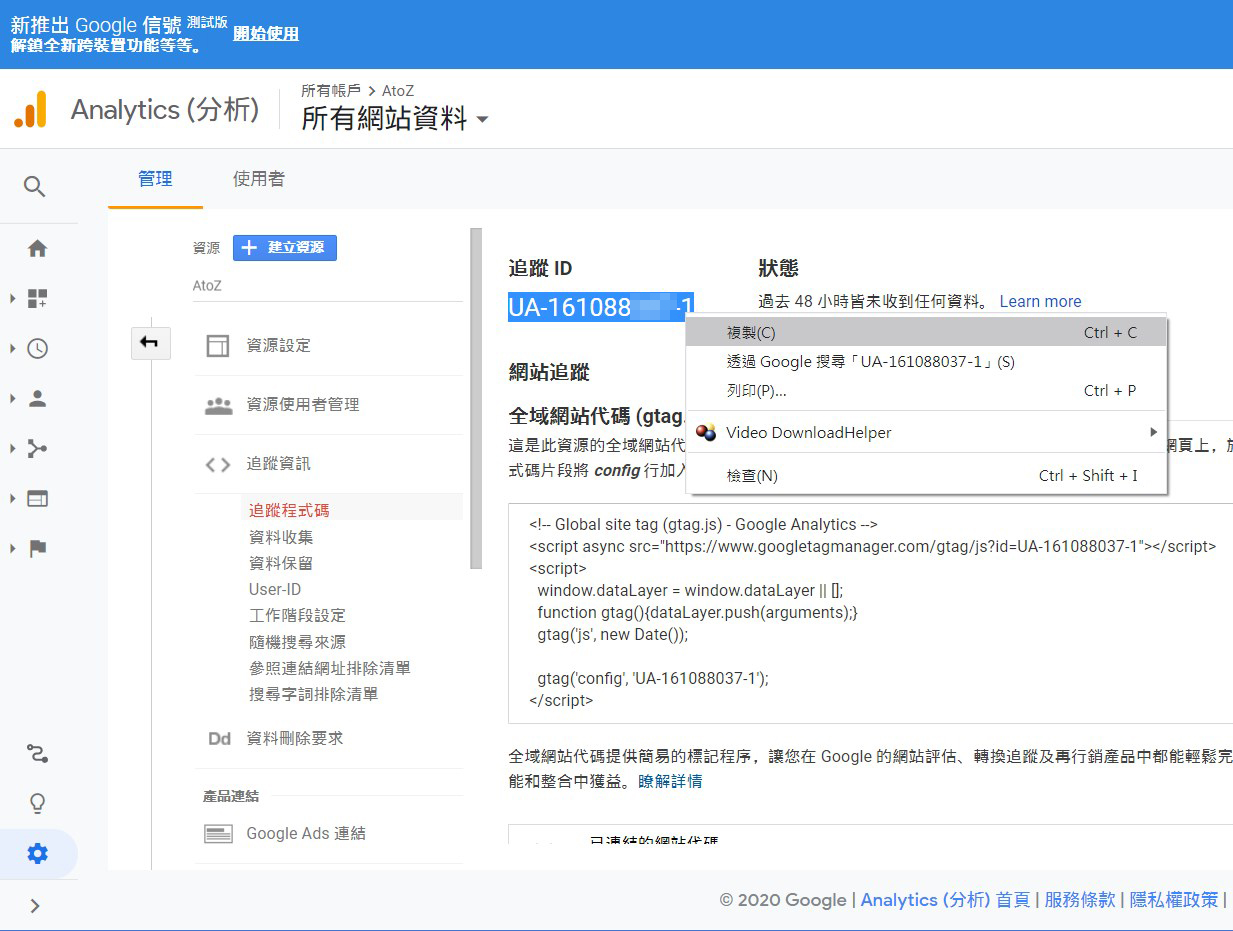 如何將GoogleAnalytics追蹤編號埋入網站1.複製剛剛申請好的GoogleAnalytics追蹤ID【例如:UA-000000-01】