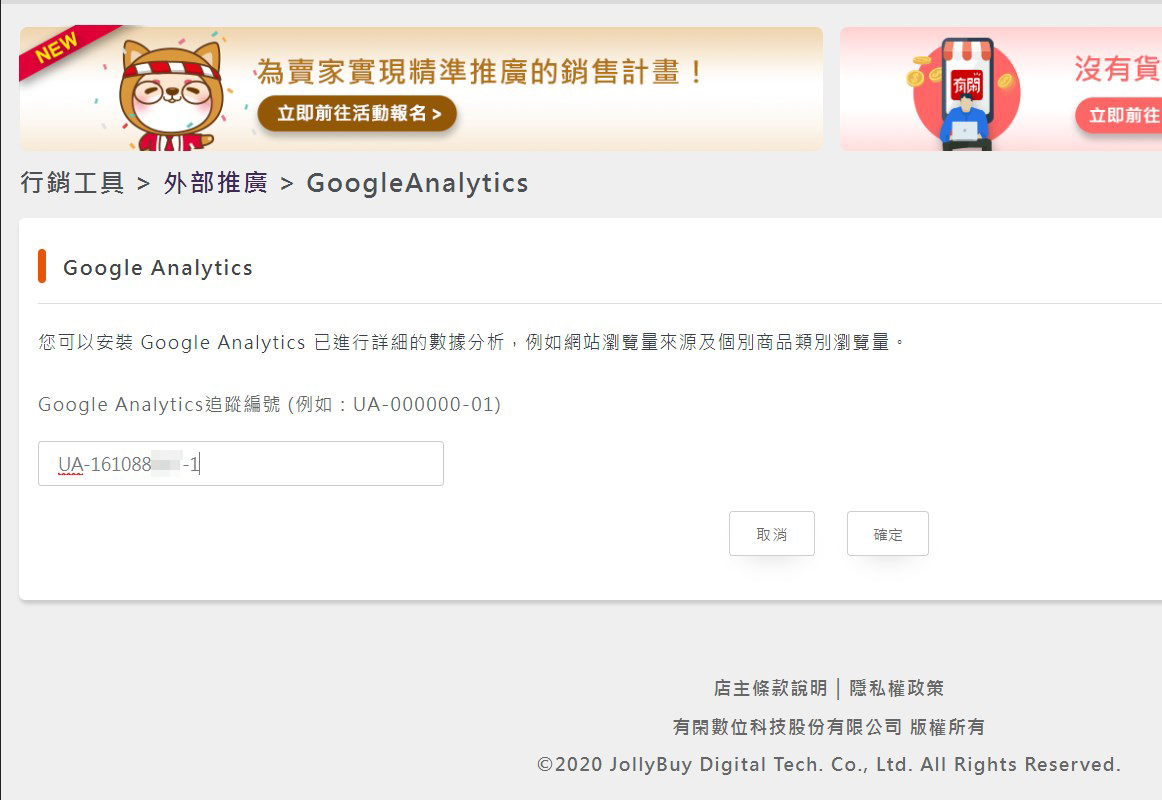 使用有閑Jollybuy開立網站,可以同步串接FB像素與GoogleAnalytics的追蹤