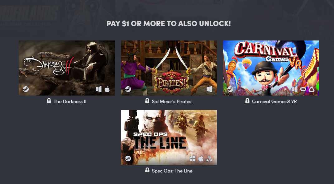 支付不同的金額可以獲得不同的遊戲。遊戲含有《黑暗領域 2》、《大海盜!》、《體感嘉年華 VR》和《特種戰線》《高爾夫俱樂部 2019 Featuring PGA TOUR》、《生化奇兵:合集》、《文明帝國 3:完全版》、《NBA 2K 熱血街球場 2》《NBA 2K20》、《WWE 2K20》、《XCOM:未知敵人 完全版》、《邊緣禁地 年度加強版》、《邊緣禁地 帥氣合輯》。