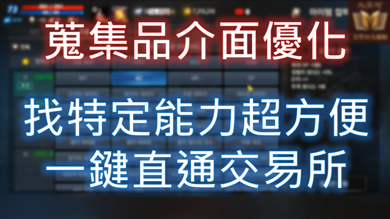現在的蒐集品要找特定能力的蒐藏得翻了又翻,找到了還得去交易所翻一次非常不方便,目前韓版已將介面調整,不但讓我們可快速找到想要的蒐藏品效果,還可以立刻直通交易所購買需要的道具裝備。 我是廣告 請繼續往下閱讀 相關新聞 《任天堂明星大亂鬥特別版》最終鬥士出爐!《王國之心》索拉參戰Snake欣賞薩姆斯屁屁!法國任天堂推特圖片遭控性騷擾急刪文Xbox總裁:主機供貨不足的問題今年恐怕無法解決 天堂M蒐藏品